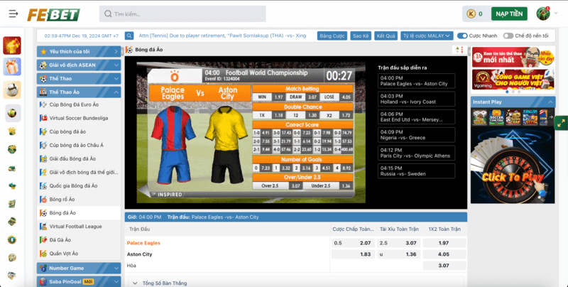 Sảnh cá cược thể thao ảo trên Febet mang đến một trải nghiệm cá độ độc đáo và thú vị, dành cho những ai yêu thích sự nhanh chóng mà không cần phải chờ đợi theo lịch thi đấu thực tế.